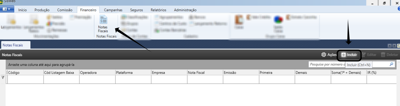 Em algumas situações, a corretora precisa emitir uma nota fiscal para determinada operadora a fim de receber o pagamento. No SisWeb, é possível registrar (transcrever) essa nota fiscal e vinculá-la a listagem correspondente, garantindo controle e organização financeira.