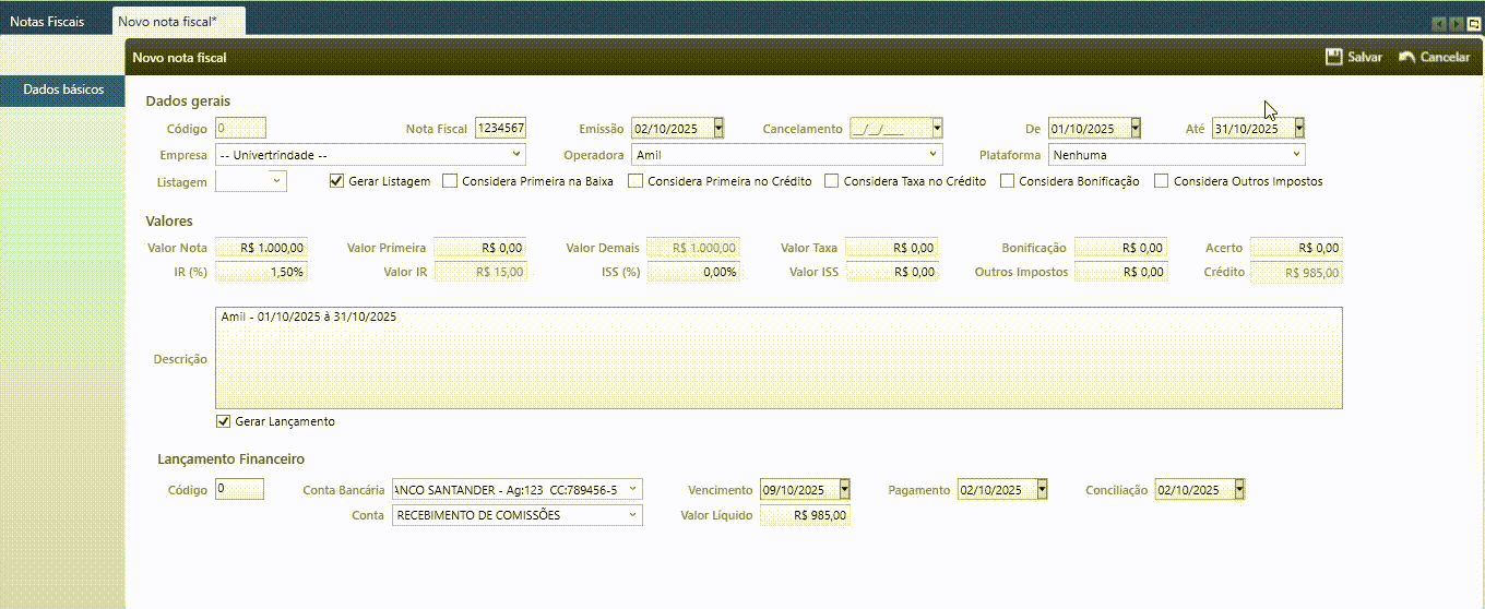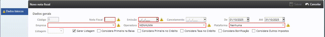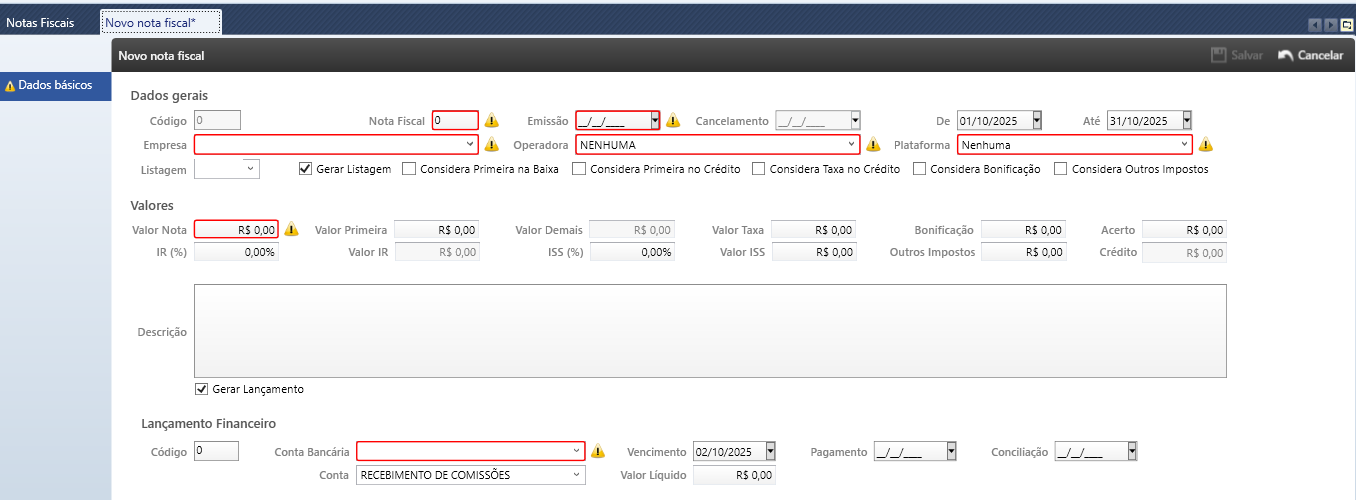 Preencha os campos exibidos. Os campos em vermelho são de preenchimento obrigatório para que consiga salvar a nota.