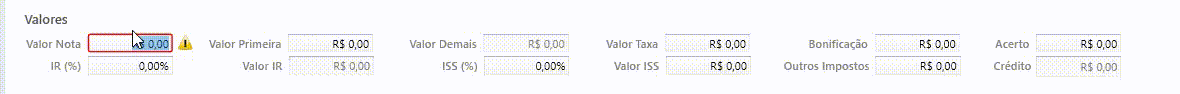 Apesar da variedade de campos, o único campo obrigatório é o Valor Total da Nota. Se houver impostos, eles devem ser informados em seus respectivos campos. Os demais campos devem ser usados apenas em situações específicas.